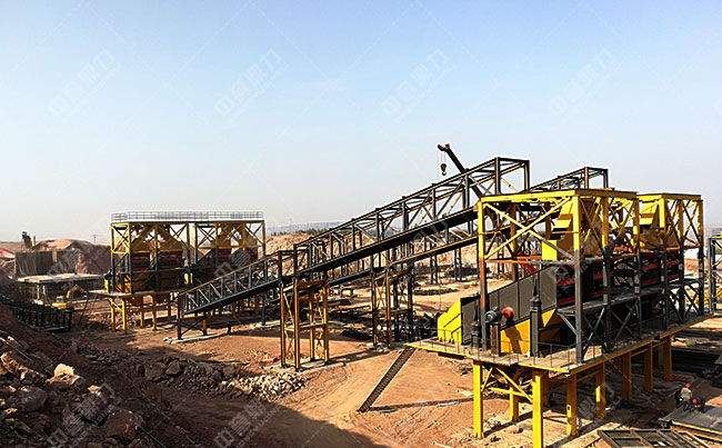 煤矸石加工項目的輸送現(xiàn)場,使用了皮帶輸送機將篩分后的石料輸送到相應的料倉內存儲。