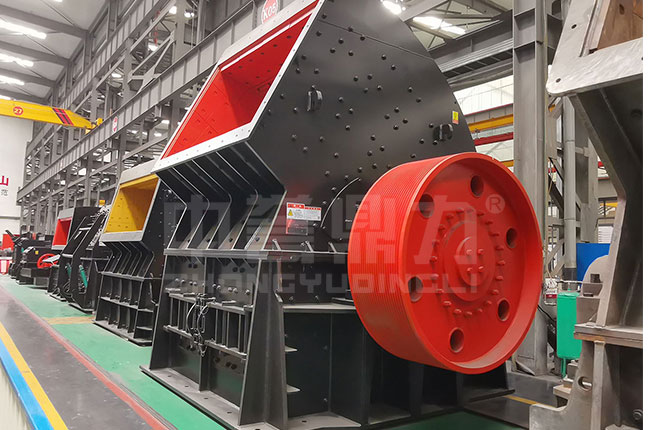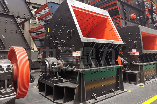 物料進(jìn)入破碎腔內(nèi),堆放在機(jī)內(nèi)特設(shè)的中間托架上,錘頭在中間托架的間隙中運(yùn)行,將物料連續(xù)擊碎而墜落,墜落的小塊物料經(jīng)高速運(yùn)轉(zhuǎn)的錘頭進(jìn)一步打擊細(xì)碎,后經(jīng)弧形篦板篩選合格后排出。