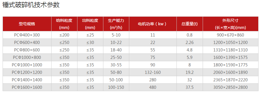 其他廠家錘式破碎機技術參數(shù):